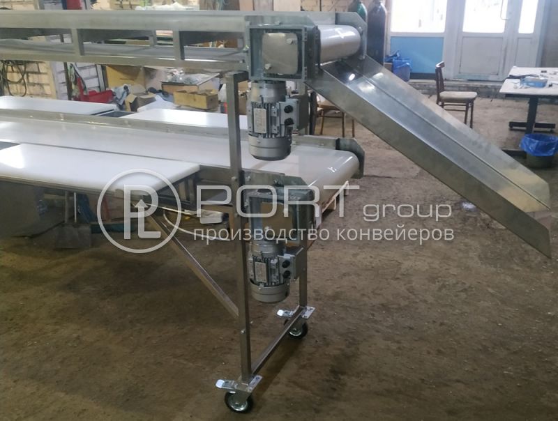 Были изготовлены 2 конвейера полностью из нержавеющей стали марки AISI 304 с усиленной рамой. Оба передвижные, на вращающихся колесах с тормозом. Лента из ПВХ, двухслойная, пищевая. Конвейеры предназначены для разделки и перемещения рыбы. Для этих целей двухъярусный конвейер оснащен шестью разделочными столами из полипропилена толщиной 20 мм и четырьмя выдвижными ящиками из нержавеющей стали для обрези рыбы. С верхнего яруса груз удаляется по наклонному склизу.